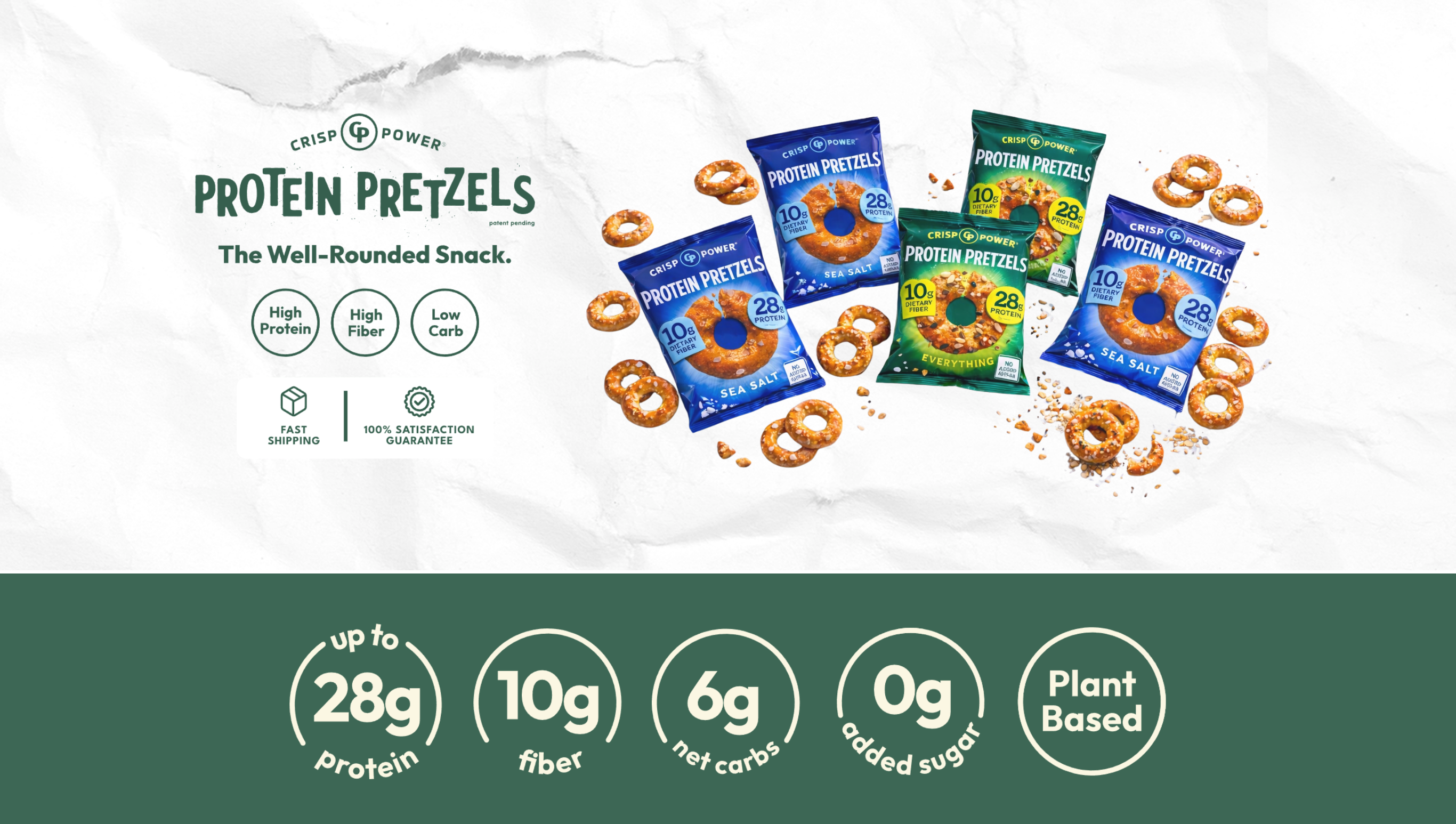 Crisp Power Protein Pretzels contain 10g of fiber in a 50g bag!